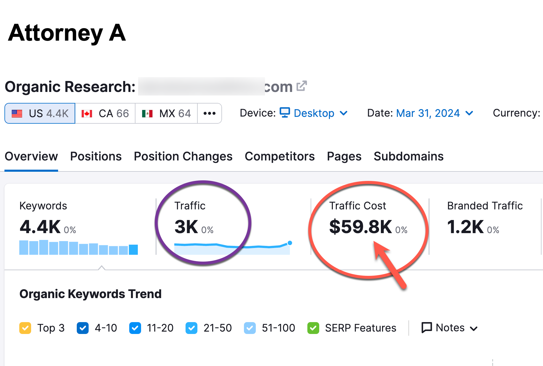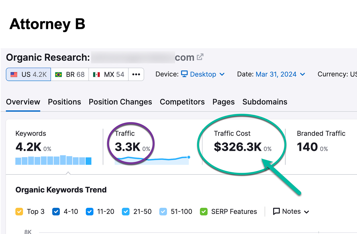 Attorney A website traffic worth $326k in equivalent Google PPC spend.